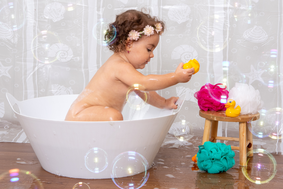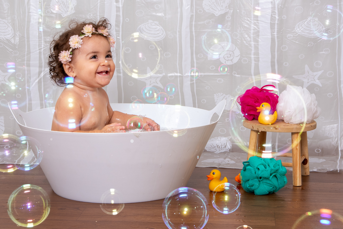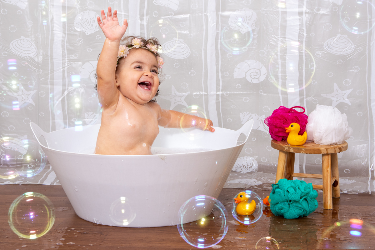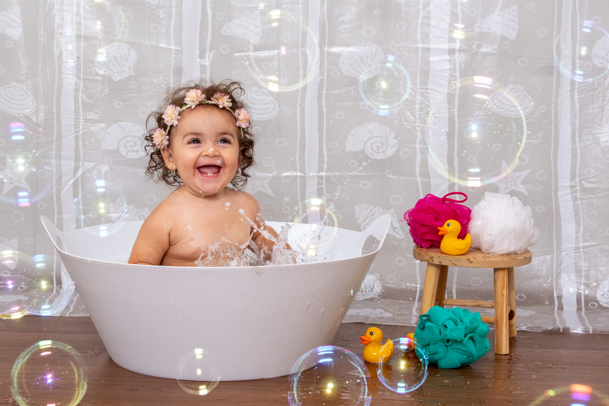 Depois fazemos fotos com o bolo e termina com um banho cheio de espuma e alegria.